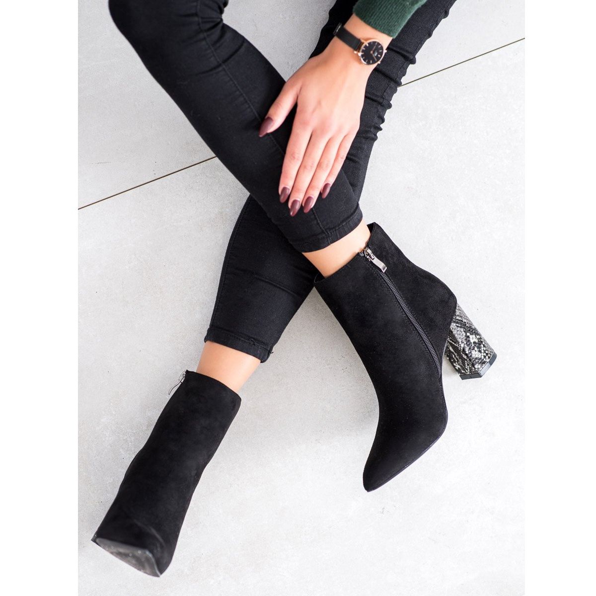 Otkrijte zadivljujuće gležnjače s visokom petom Goodin Snake Print u elegantnoj crnoj boji! Izrađene od visokokvalitetne eko antilop kože, ove gležnjače kombiniraju bezvremenski stil s modernim naglascima. Ukrasna blok peta visine 8,5 cm ne samo da dodaje stil, već osigurava i udobnost pri nošenju, što ih čini savršenim za svakodnevnu upotrebu i razne prigode, kao što su proslave ili večernji izlasci.