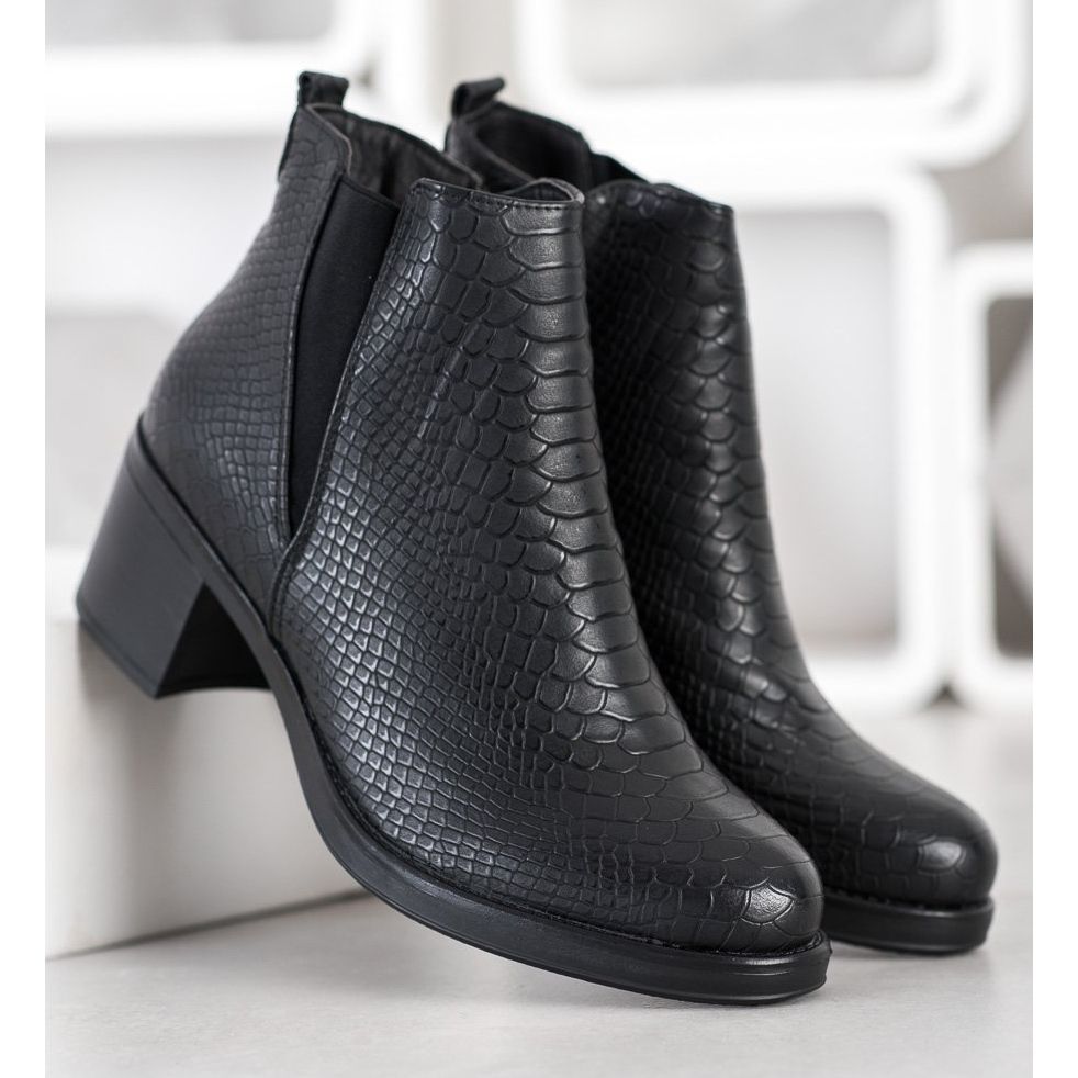 Otkrijte moderne i elegantne gležnjače Sweet Shoes u crnoj boji koje će savršeno upotpuniti vašu jesensko-zimsku garderobu. Ove unikatne ženske gležnjače ističe gornjište izrađeno od visokokvalitetne ekološke kože, ukrašeno reljefnim uzorkom koji podsjeća na krokodilsku kožu.
