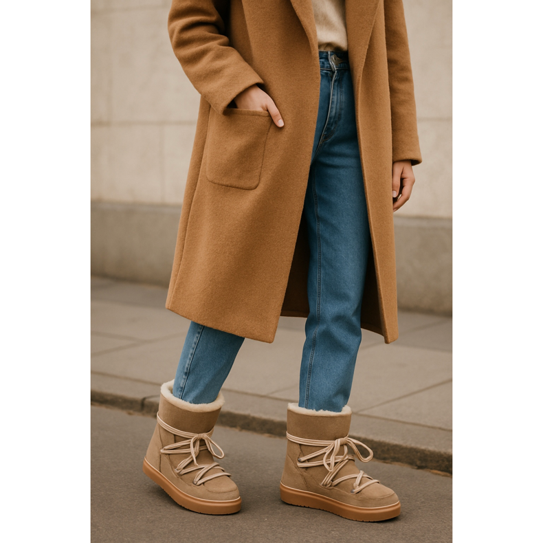 Za ljubitelje boho stila i prirodnih materijala savršene će biti čizme za snijeg poput Inuikii ili UGG. Izrađene od ovčje kože, vezane debelim vezicama, savršeno pristaju uz vunene kapute i mom fit traperice. Ove sezone dominiraju modeli u nijansama bež, karamele i čokolade. Nevjerojatno su topli i udobni - kao da hodate po oblaku, čak i kada je vani vrlo hladno.