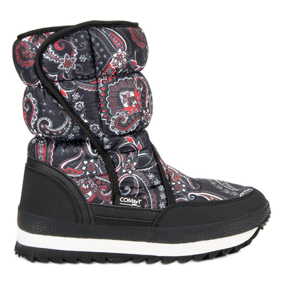 Izrađene od visokokvalitetnog tekstilnog materijala, čizme za snijeg odlikuju se originalnim uzorkom koji spaja klasične boje - crnu, bijelu i crvenu - u atraktivan cvjetni i geometrijski motiv. Zahvaljujući povišenom potplatu visokom do 3 cm i izolaciji od mekanog krzna vaša će stopala biti savršeno zaštićena od hladnoće i vlage, što je posebno važno tijekom dugih zimskih šetnji.