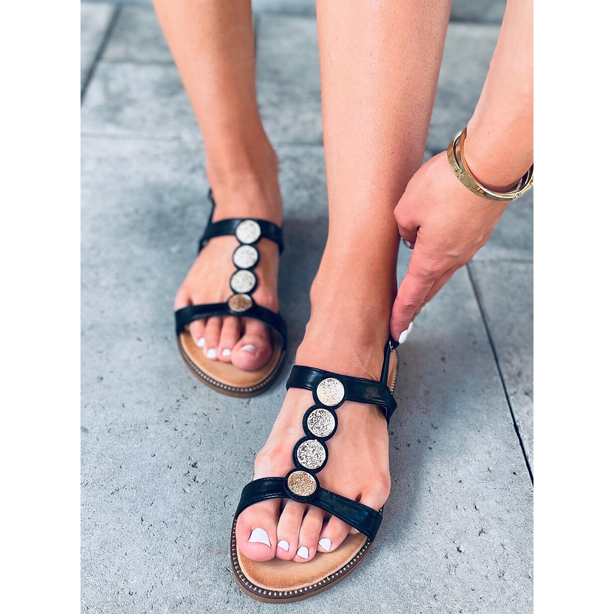 Otkrijte ljetnu eleganciju uz Cosme Black ženske sandale u crnoj boji! Ove zrnate sandale klasičan su izbor koji savršeno otkriva stopalo, dodajući mu lakoću i stil. Zlatni ukras naglašava čar svake ljetne preplanulosti, čineći stopala jedinstvenim.
