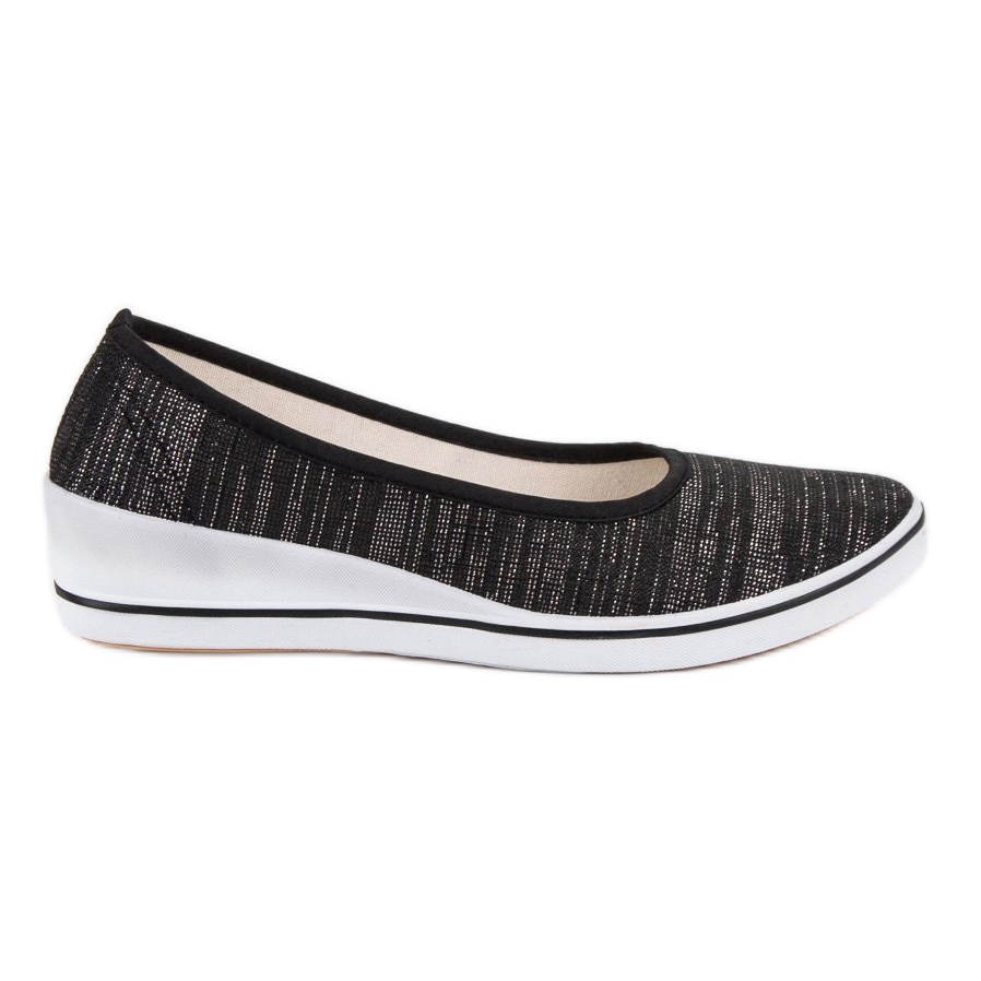 Black Wedge balerinke brenda Comer savršen su izbor za žene koje cijene udobnost i eleganciju u svakodnevnom životu. Ove klasične natikače imaju okrugli vrh i mekanu, učvršćenu kopču koja osigurava udobnost čak i kada se nosi dulje vrijeme. Izrađene od pletene tkanine ugodne na dodir, balerinke lagano svjetlucaju sivom bojom, dodajući im suptilan šarm.
