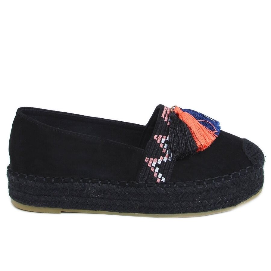 1735 Crne espadrile s resama savršen su izbor za žene koje traže elegantne i udobne cipele za svaki dan. Ovaj model s ravnim potplatom savršeno se uklapa u boho trendove zahvaljujući pletenim lanenim prstima i jedinstvenom izvezenom uzorku ukrašenom resicama.