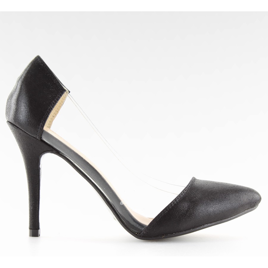 Asimetrične visoke potpetice L-836 crne - crne, elegantne salonke s prozirnim stranicama koje će naglasiti vitkost nogu i dodati senzualan karakter stajlingu. Asimetrija vrhova i bademasti vrh stvaraju originalan, moderan stil, savršen za večer i za svakodnevne, elegantnije setove.