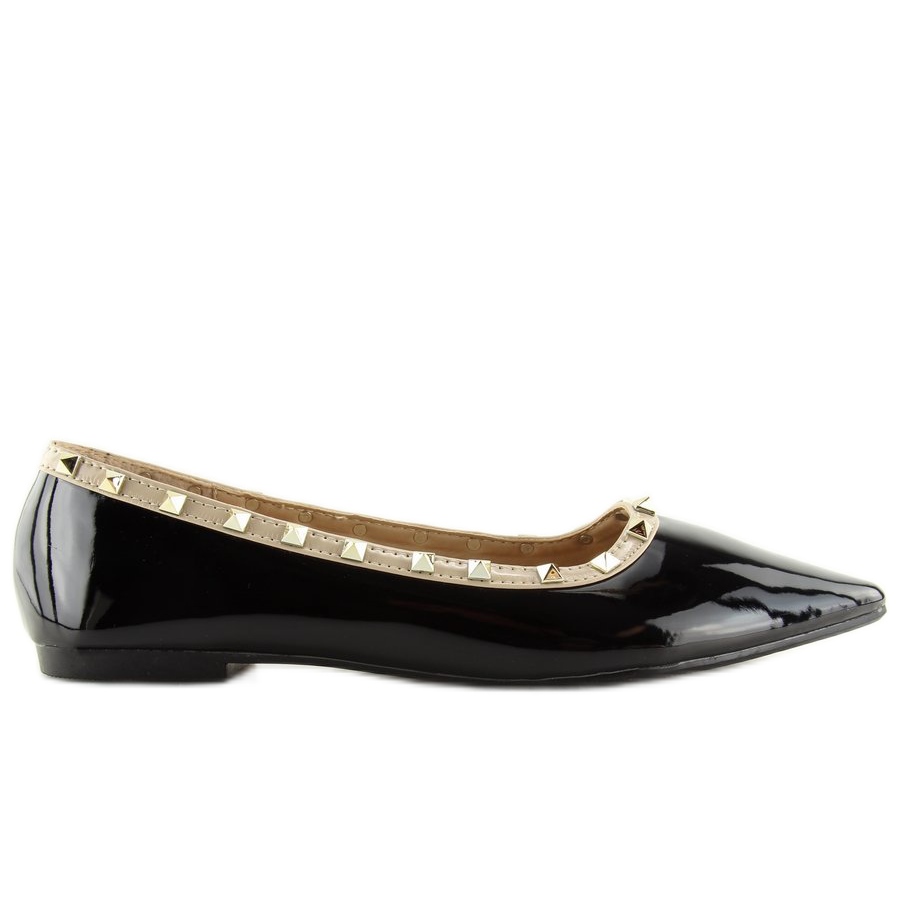 Crne balerinke s nitnama 127-16 Black jedinstvene su ženske cipele koje spajaju eleganciju s modernim stilom. Izrađene od lakirane ekološke kože, ove balerinke privlače pažnju ne samo svojim tankim oblikom, već i upečatljivim detaljima u obliku nitni koji im dodaju karakter.