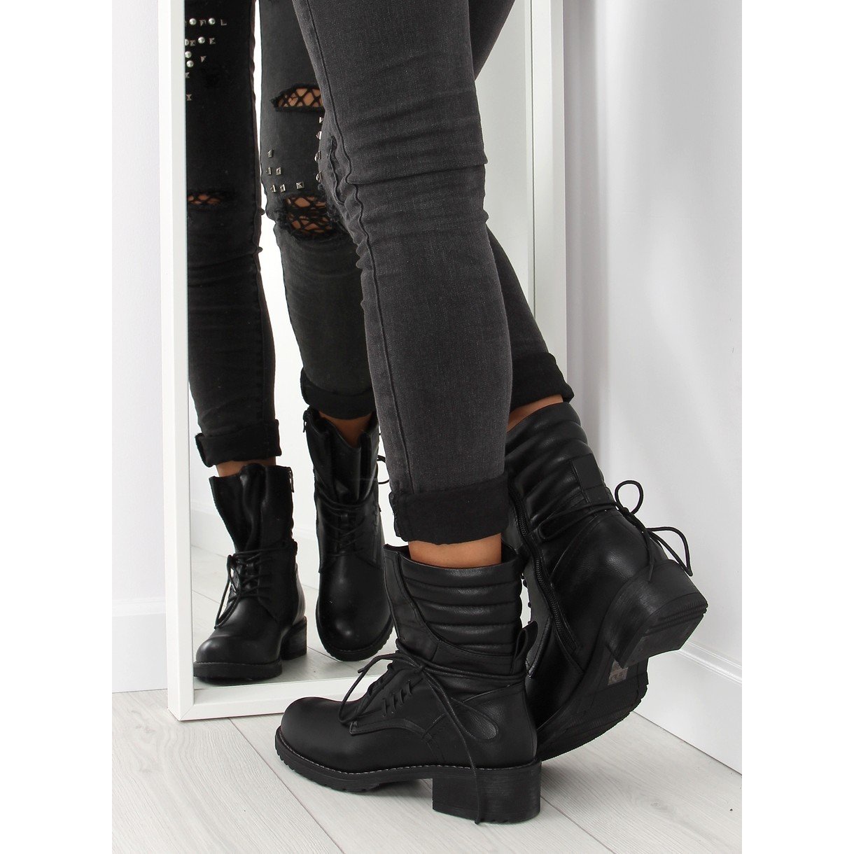 Otkrijte svoju divljinu uz crne 9560 crne čizme! Ove jedinstvene ženske čizme spajaju eleganciju i vojnički stil. Izrađene od visokokvalitetne, mesnate ekološke kože, osiguravaju izdržljivost i udobnost nošenja. Čvrst potplat i široka peta visine 4 cm jamče stabilnost pri svakom koraku.