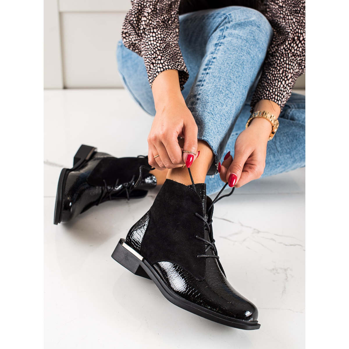 Izrađene od visokokvalitetnih materijala, čizme imaju gornjište od ekološke kože s dodatkom imitacije antilop kože što im daje jedinstven karakter. Originalni životinjski uzorak privlači pažnju, a crna boja ih čini iznimno univerzalnima.