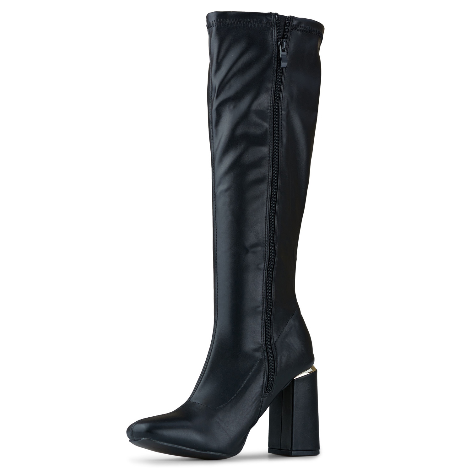 Klasične ženske čizme izrađene od ekološke kože, s zagrijavanjem i stabilnom petom klipa visokog 9,5 cm. Model koljena (visina gornjeg 37 cm) s kvadratnim nosom i udobnim zatvaračem za zatvarač - savršen za hladnije dane.