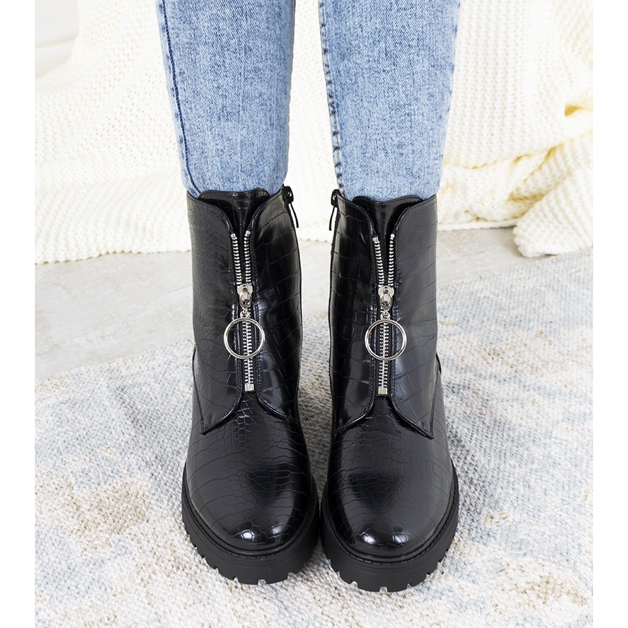Moderan gornji dio čizama ukrašen je lažnim patentnim zatvaračem, što im daje originalan karakter i čini ih iznimno elegantnim. Visoki, trapper potplat je apsolutni must-have među suvremenim trendovima, osiguravajući udobnost i stabilnost prilikom nošenja.