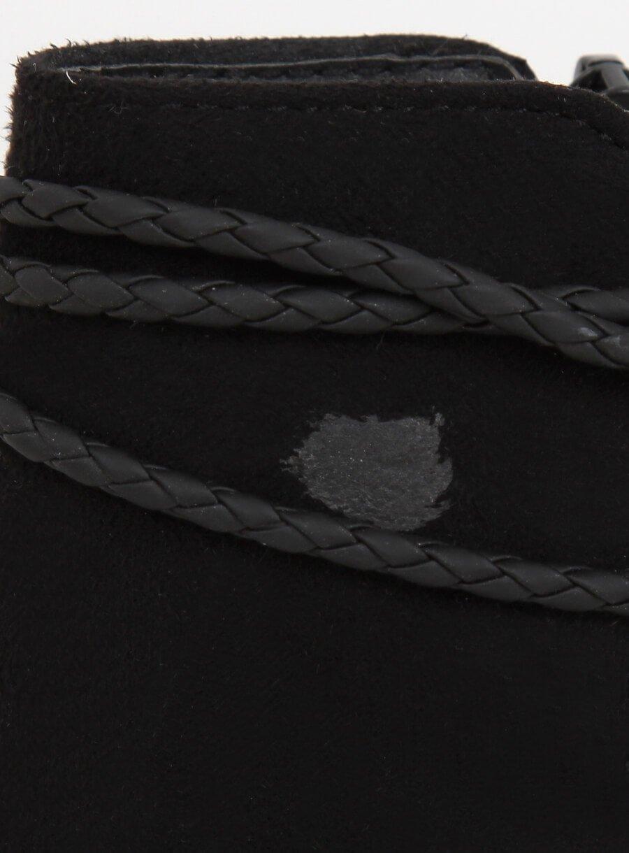 Moderne crne ženske čizme na stabilnom postu, idealne za svakodnevne i polu -formalne stilizacije. Ekološki sukni gornji dio ukrašen je obrubljenim trakama, koje učinkovito omotavaju kocku. Unutrašnjost je obložena mekim krznom, što osigurava udobnost nošenja. Stavljajući praktični patentni zatvarač postavljen sa strane.