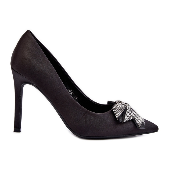 Klasične crne visoke potpetice izrađene od tkanine koja imitira satensku tkaninu koja će dodati stil bilo kojoj stilizaciji. Na prednjoj strani, prekrasan ukrasni luk ukrašen svjetlucavim rhinestones/cirkonima privlači oko, dok Spitz optički mrša noge. Ekološka kožna umetka osigurava udobnost, a peta od 10,5 cm naglašava lik, dajući eleganciju i ženstvenu.