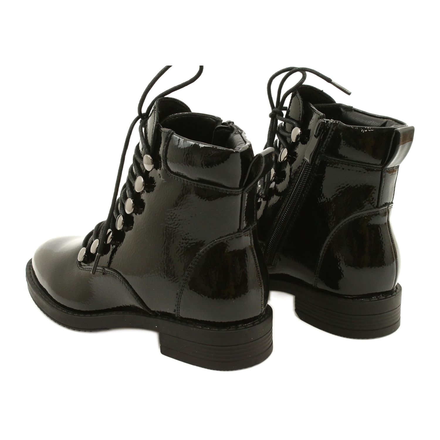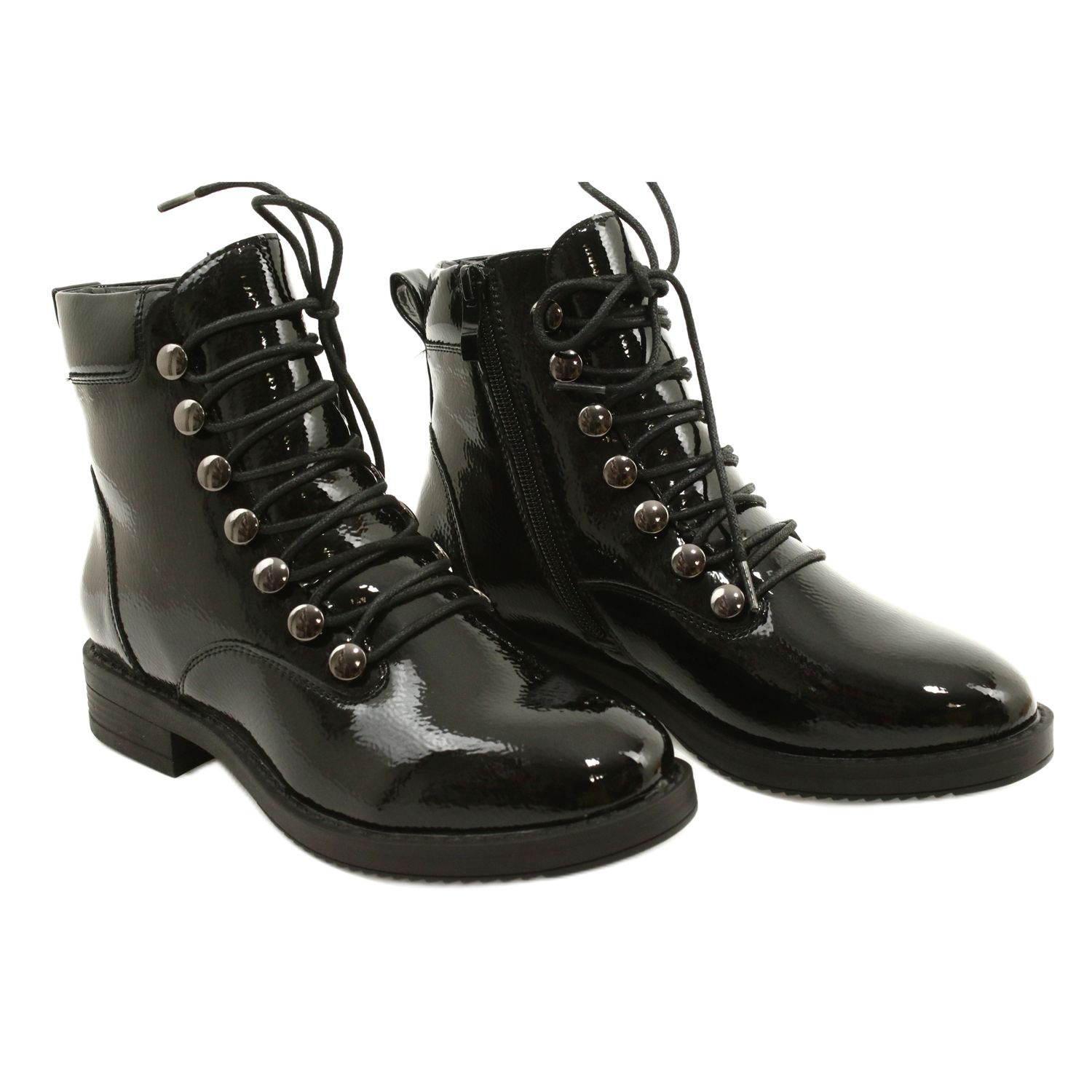 Crne, lakirane čizme koje će raditi i u svakodnevnim i u izlaznim stilizacijama. Kombinacija praktičnosti i modernog dizajna: pričvršćena bočnim bravama, dodatno opremljena vezanje koje vam omogućuje da bolje odgovarate ubodu. Suptilna, ravna peta (3 cm) i gornji doseg gležnja (oko 14 cm) osiguravaju utjehu tijekom dana.