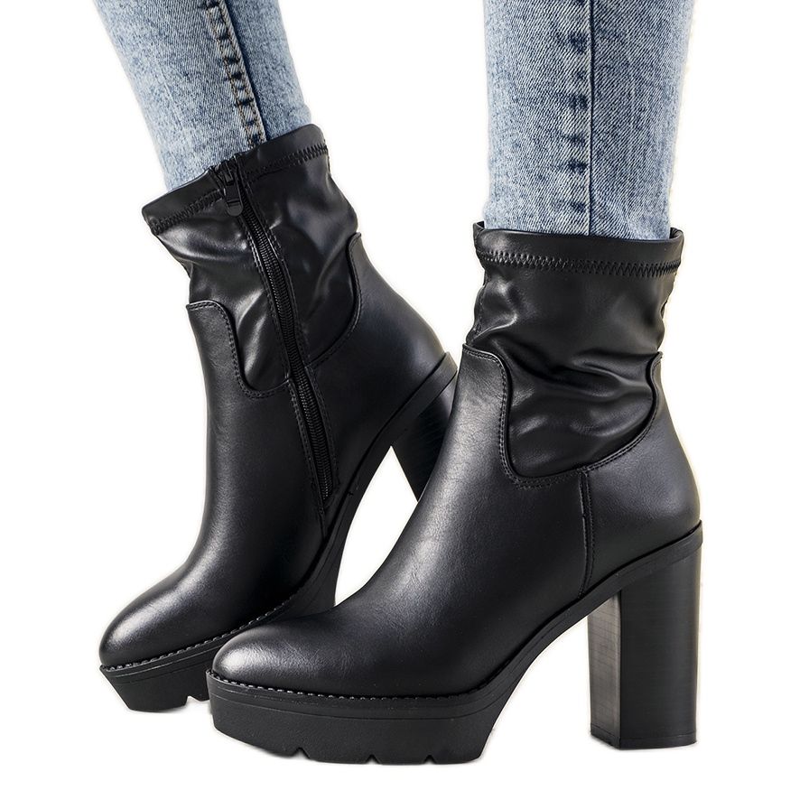 Crne gležnjače na visoku petu od kvalitetne elastične tkanine savršen su izbor za proljeće i tople jesenske dane! Ove elegantne cipele, izrađene od ekološke kože, spajaju stil i udobnost. Fleksibilni materijal savršeno pristaje uz noge, a visoka peta od 11 cm lijepo će istaknuti liniju nogu i učiniti ih vitkijima.