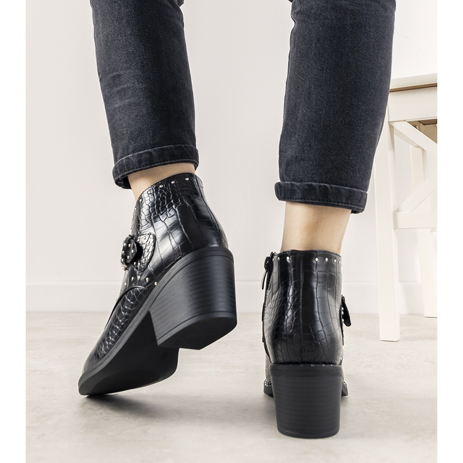 Crne gležnjače na visoku petu s Montiana kopčom savršen su izbor za žene koje žele spojiti stil s udobnošću. Jedinstveni izgled modela Montiana, inspiriranog krokodilskom kožom, zasigurno će privući svačiju pozornost. Ne samo da pružaju elegantan izgled, već i funkcionalnost zahvaljujući patentnom zatvaraču koji omogućuje jednostavno obuvanje i izuvanje.
