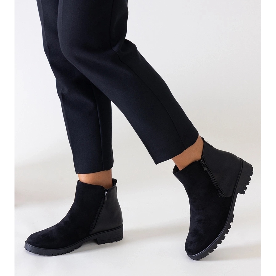 Čizme gležnja imaju vitak, bademov nos koji im daje stil, a njihova crna boja odgovara mnogim odijelima. Ravna peta od 3,5 cm omogućuje vam da se udobno krećete tijekom dana, što ih čini odličnim izborom i za svakodnevne i za elegantnije stililizacije.
