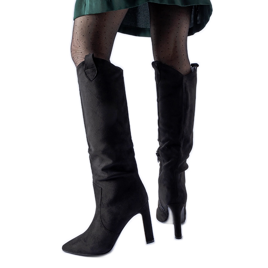 Ekspresivne, elegantne i pune karaktera - ove crne kaubojske čizme na Draper Postu prijedlog su žena koje se žele istaknuti. Nos Spitza i stabilan post s visinom od 10 cm daju cipelama malo ekstravagancije, a istovremeno održavajući udobnost nošenja. Klasični crni suek eko -odlazni i minimalistički rez bez dizajna čine čizme lako odgovaraju i casual stylingu i elegantnije za večernji izlet ili poslovni sastanak.