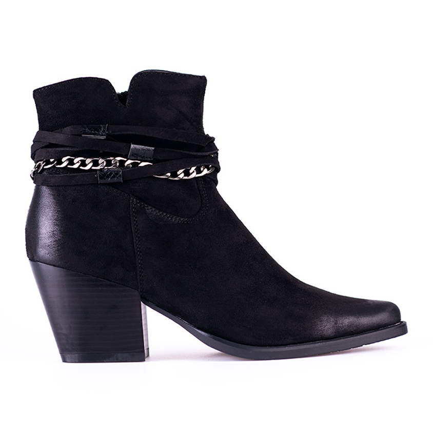 Slobodno nosite ove gležnjače kako za svakodnevne prilike tako i za posebne trenutke. Za prekrasan izgled pobrinut će se elegantna crna boja i ukrasni lančić koji je originalan element dizajna. Visina pete je udobnih 7 cm - savršeno rješenje za spoj estetike i udobnosti.