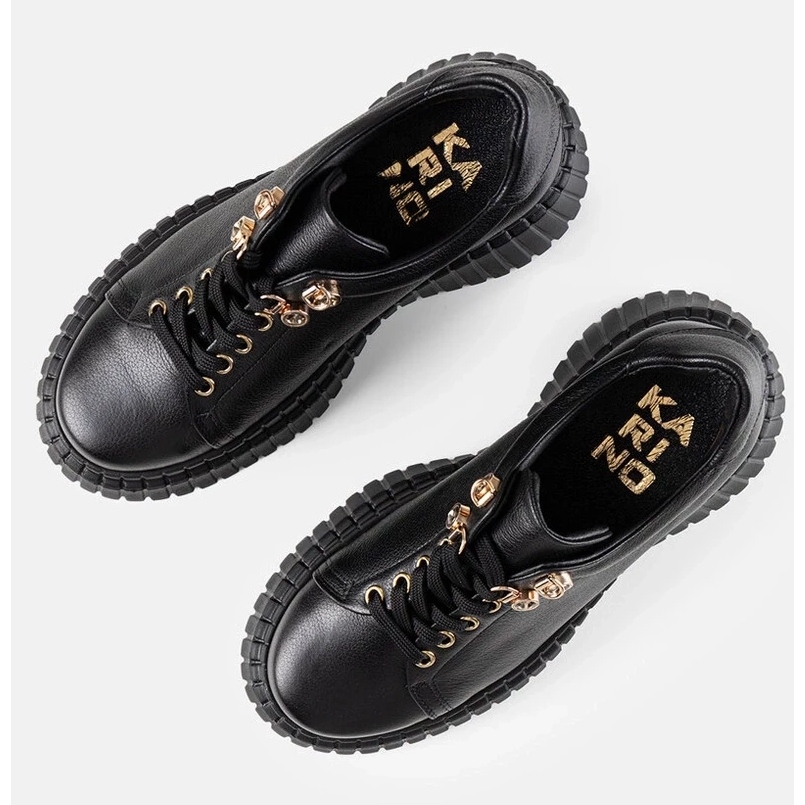 Crne kožne tenisice na karino platformi apsolutno su obavezni u svakoj ženskoj garderobi! Njihov moderni dizajn i okrugli nos čine ih savršeno u trenutne trendove. Ove niske cipele od čipke idealan su prijedlog za vruće dane - izrađene od visokokvalitetne prirodne kože, kombiniranog stila s udobnošću nošenja.