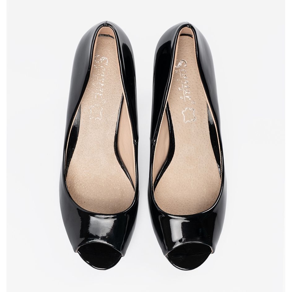 Crne lakirane pumpe za Saastar sa golim prstima savršena je kombinacija elegancije i udobnosti koja će obogatiti bilo koju žensku garderobu. Stvorene od ekološke lakirane kože visokog kvaliteta, ove cipele zasljepljuju spektakularnim sjajem, privlačeći izgled i naglašavajući ženski šarm. Izgrađena -u peti i tankom pin s visinom od 8 cm čine crpke ne samo stilskim, već i ugodnim za nošenje već duže vrijeme.