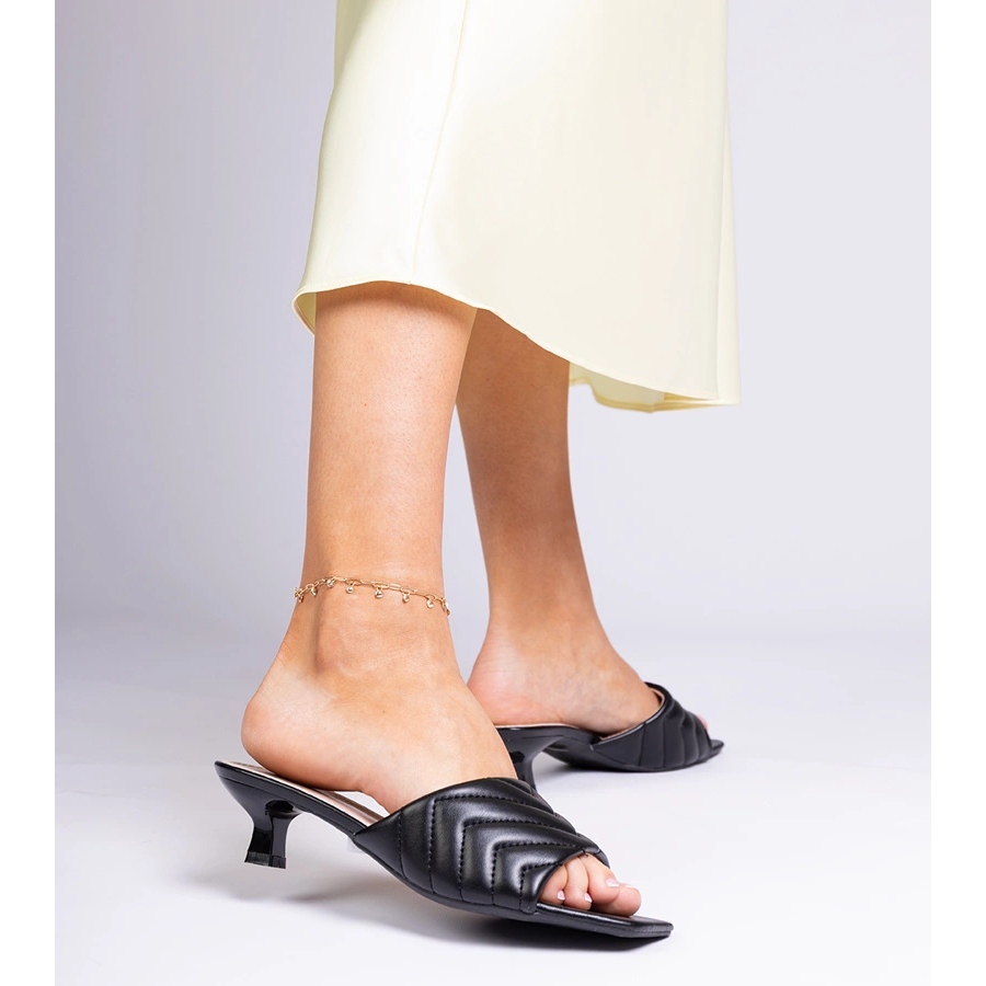 - Dizajn: otkriven kvadratni nos i otkrivena peta; široka pruga s prešivanjem