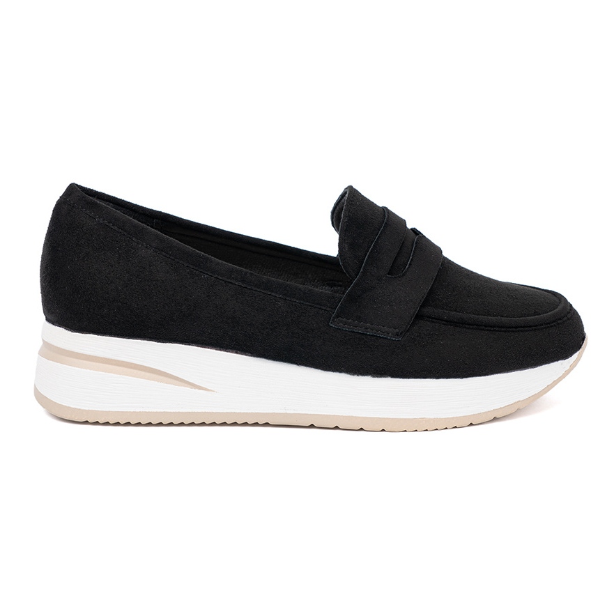 Crne mokasine karakterizira klizni pričvršćivač, što olakšava stavljanje i skidanje, a ugrađeno pričvršćivanje osigurava stabilnost i potporu za stopalo. Visina platforme od 5 cm i visina pete od 3-5 cm jamči udobnost nošenja, a istovremeno dodaje elegantnu figuru.