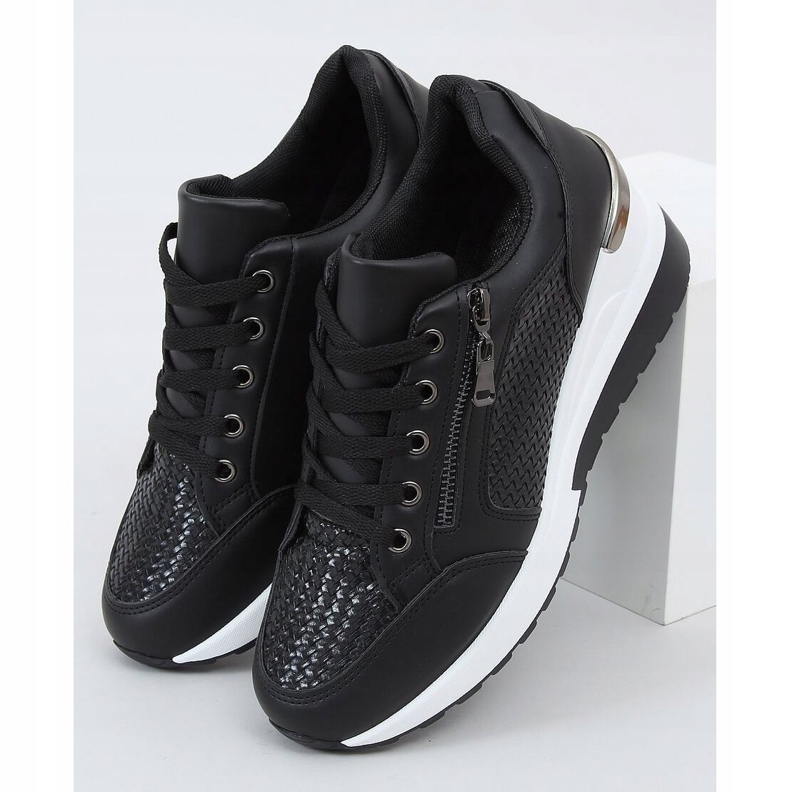 MY-2716 Crne sportske cipele sa skrivenim klinom savršen su izbor za žene koje cijene kombinaciju udobnosti i stila. Ovi modeli na vezanje odlikuju se modernim dizajnom i originalnim, reljefnim uzorkom koji privlači pažnju. Klin visine 6 cm ne samo da dodaje eleganciju, već osigurava i udobnost tijekom svakodnevnih aktivnosti.