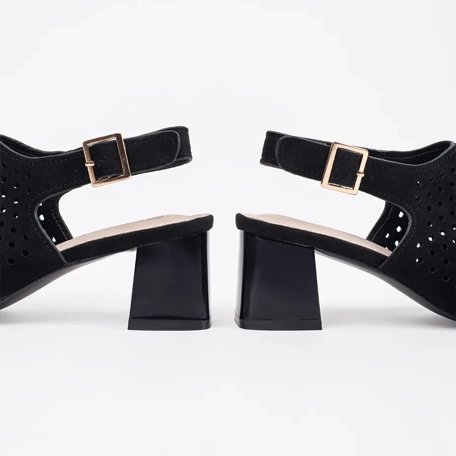 Stabilna traka s visinom od 7 cm savršeno naglašava lik, istovremeno pružajući udobnost čak i uz dužu upotrebu. Kožni umetak čini svaki korak u ovim sandalama čistim zadovoljstvom. Spektakularna kopča ne samo da olakšava stavljanje i uklanjanje obuće, već dodaje i elegantan stil.