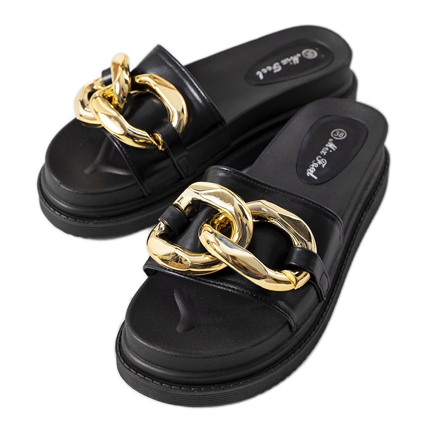 Izrađene od visokokvalitetne ekološke kože, Berloz japanke spajaju moderan dizajn s funkcionalnošću. Okrugli nos i platforma visoka 5 cm osiguravaju udobnost nošenja, a njihova klasična crna boja pristaje uz svaki stil. Dodatna prednost je suptilni lančić koji im daje originalan karakter.