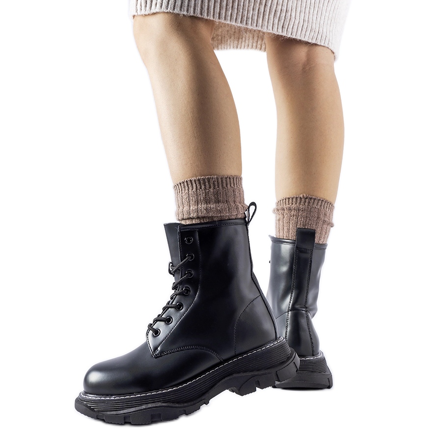 Moderni radnici na masivnom potplatu Borsano obavezni su od svake urbane garderobe. Izrađene od visokokvalitetne ekološke kože u univerzalnoj crnoj boji, kombiniraju sirovi, moderan izgled i svakodnevnu udobnost. Ploj -čizme u klasičnom, okruglom nosu s vezanjem osigurava neke uklapanja i udobnosti nošenja, a čvrsti gumeni potplat s platformom (oko 4,5 cm) dodaje optički centimetre i stabilnost.