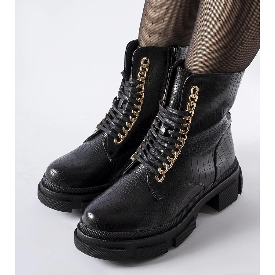 Crni radnici s dekorativnim lancem Goodland - moderni, udoban i pun karaktera. Ovaj model kombinira urbani stil s praktičnim rješenjima: posegne za gležnjem, ima ravnu, stabilnu petu i učinkovit lanac koji daje cijeli moderan, sirov izraz. Savršeno za privremene sezone - jesen i proljeće.