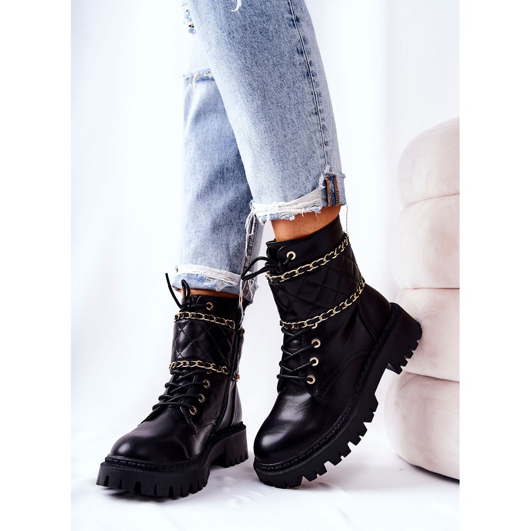 Moderne, izdržljive i ugodne - kaleanorske čizme za rad su prijedlog za žene koje svakodnevno cijene modni izgled i utjehu. Izrađene od visokokvalitetne ekološke kože, izolirane mekom pokrivačem obuće, savršeni su u jesen i zimi. Prešitani remen s ukrasnim lancem daje karakter. Model pričvršćen patentnim zatvaračem i dodatno vezan, što olakšava uklapanje.