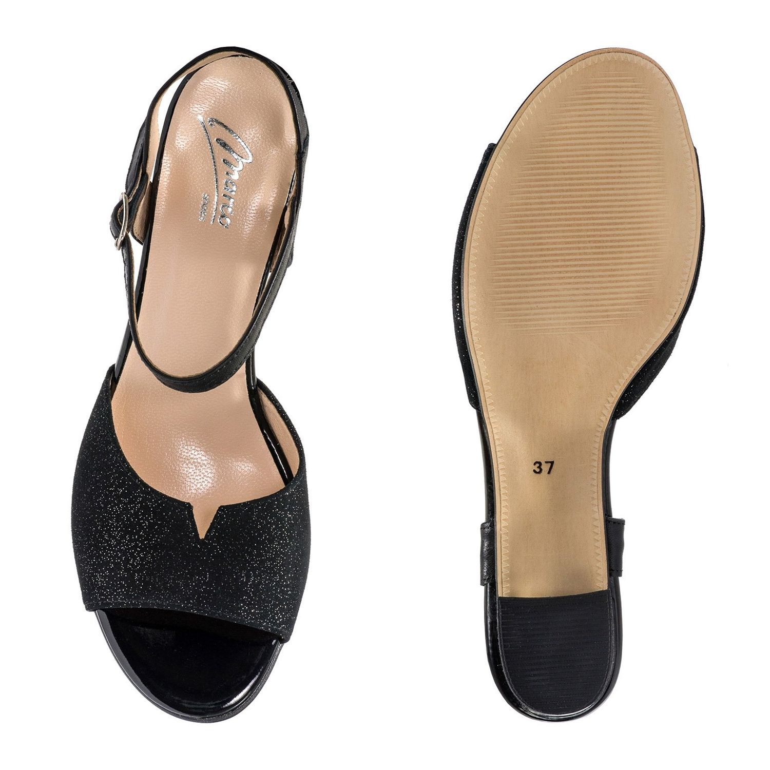 Proizvedene od strane renomiranog proizvođača Marco Shoes, ove sandale odlikuju se ne samo klasičnim i bezvremenskim dizajnom, već i zanimljivim završetkom. Naziv boje proizvođača, "crna, svjetlucava", sugerira nježan sjaj, koji cipelama daje jedinstven karakter i čini ih nevjerojatnim dodatkom večernjim kombinacijama.