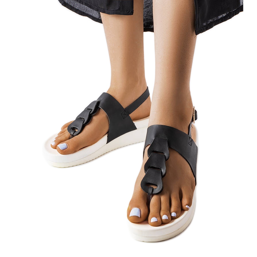Elegantni ženski okret -flopi na stabilnom klinu s visinom od 4,5 cm. Klasična crna gornje izrađene od ekološke kože kombinira se s kontrastnim bijelim gumenim potplatom - učinkovitim i univerzalnim izgledom koji odgovara svakodnevnim i elegantnim ljetnim stilizacijama.