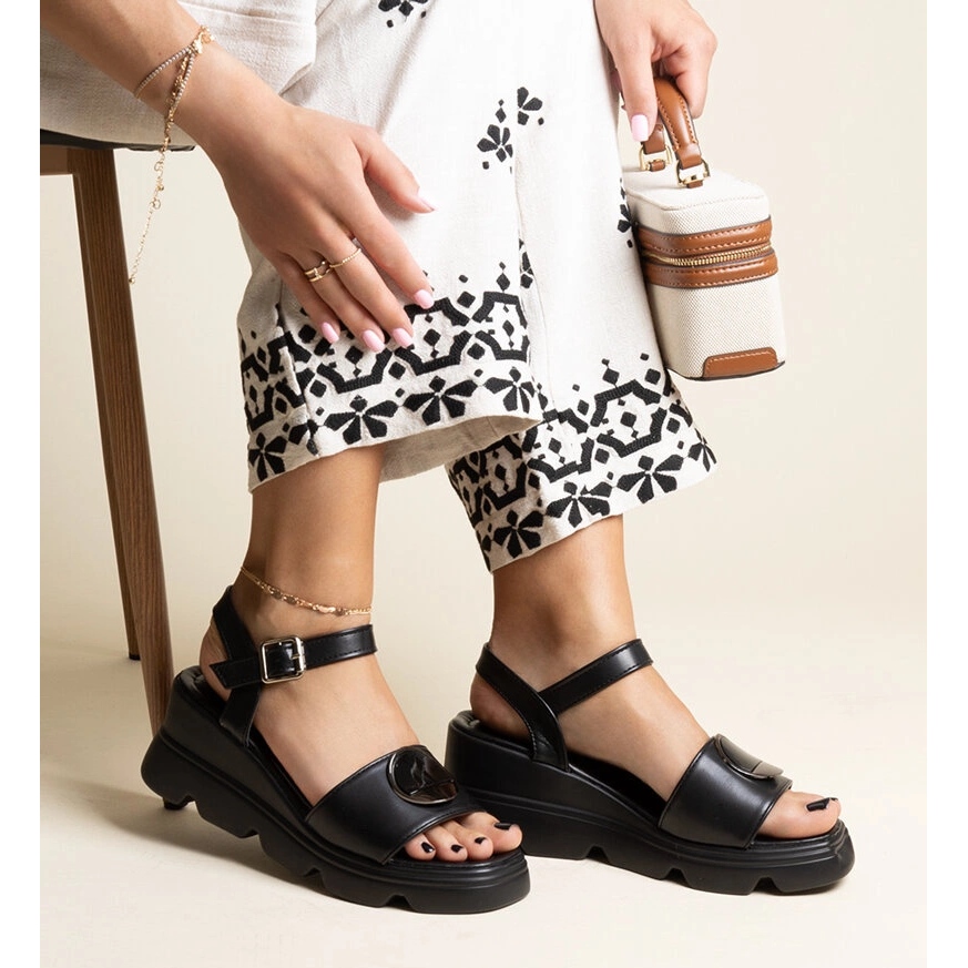 Crne sandale dizajnirane su za žene koje cijene i moderan izgled i nose udobnost. Zahvaljujući visini Koturna od 7 cm, dobit ćete dodatne centimetre uz održavanje udobnosti. Pričvršćivanje kopča omogućuje vam da savršeno odgovaraju stopalu, što sandale čini stabilnim i samouvjereno drže na nogama.