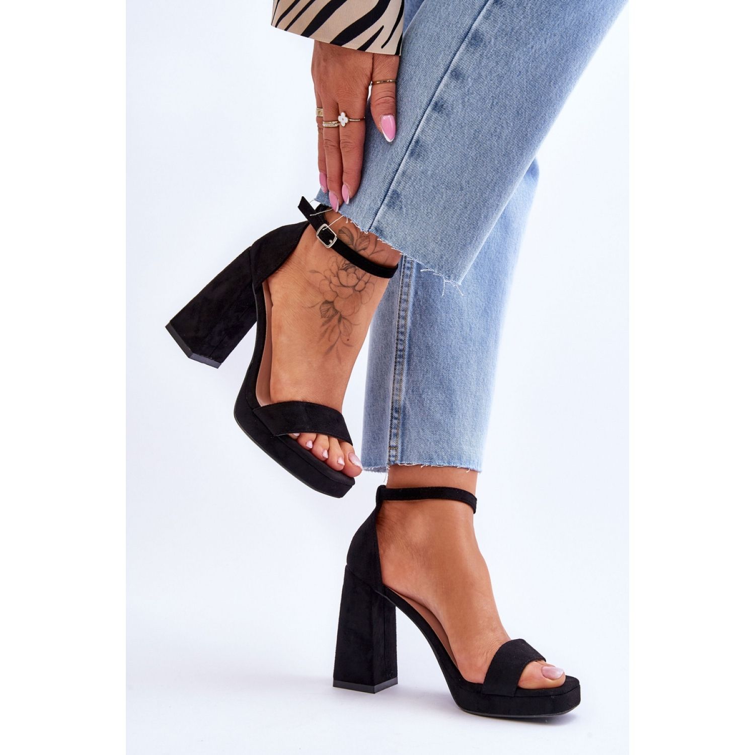Otkrijte jedinstvene crne potpetice koje će postati neodvojivi element vaše proljetne i ljetne garderobe! Ove elegantne sandale razlikuju se masivnom, kvadratnom petom visokom 11 cm i udobnom platformom visoke 2 cm, što ih čini elegantnim i ugodnim za nošenje.