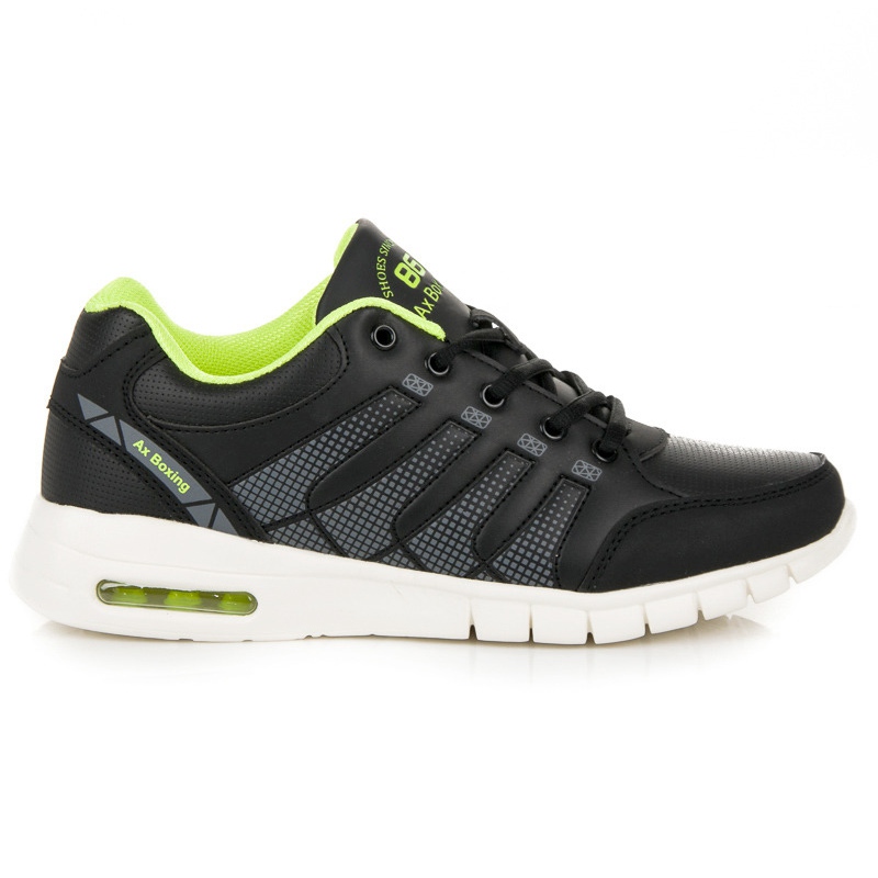 Axe Boxing - crne sportske cipele za muškarce koji cijene udobnost i moderan izgled. Model kombinira bezvremenski crni gornji dio s kontrastnim bijelim potplatom i energičnu, neonsko zelenu unutrašnjost - suptilan naglasak koji ih izdvaja iz gomile.