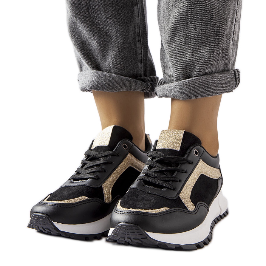 Još jedna crna tenisica sa sjajnim ukrasom Busso - stila i udobnosti u jednom. Klasični, crni ekološki kožni gornji i suptilni zlatni naglasci iz sjaja daju cipelama elegantan, večernji karakter, a bademov nos daje im lakoću i ženstvenu suptilnost.