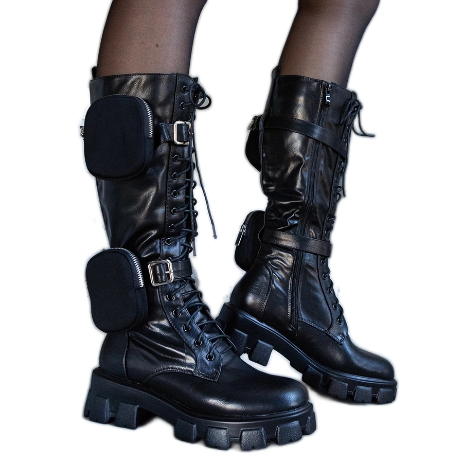 Elegantne crne tresetne čizme kombiniraju moderan, masivan izgled s praktičnim rješenjima. Izrađena od visokokvalitetne ekološke kože, s gustim, obnovljenim potplatom i okruglim nožnim prstima. Karakteristični element je ukrasni pojas s kopčom i malim vrećicama - idealna za ključeve ili male predmete. Čizme vezane ispred na čipkama, sve dok se strana ne pričvrsti patentnim zatvaračem za lako stavljanje. Izolirana unutrašnjost pruža udobnost u hladnijim danima.