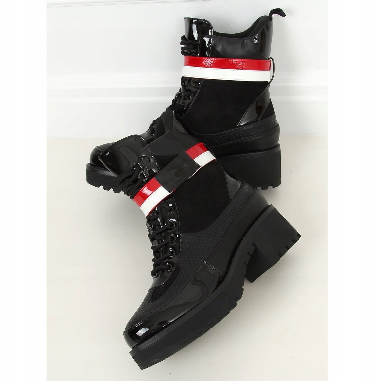 Pojedinosti: Crne ženske čizme na vezanje NS086 Crne bijela crna crvena