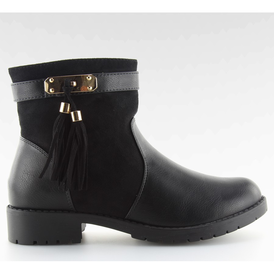 Predstavljamo elegantne crne ženske gležnjače Y8567 crne - savršen izbor za prijelazno godišnje doba! Ove elegantne cipele odlikuje prekrasna kombinacija punozrnate eko kože i eko brušene kože, što im daje jedinstven karakter. Ukrasni remen sa zlatnim detaljima i resicama daje im sofisticiran izgled, savršen za razne prigode.