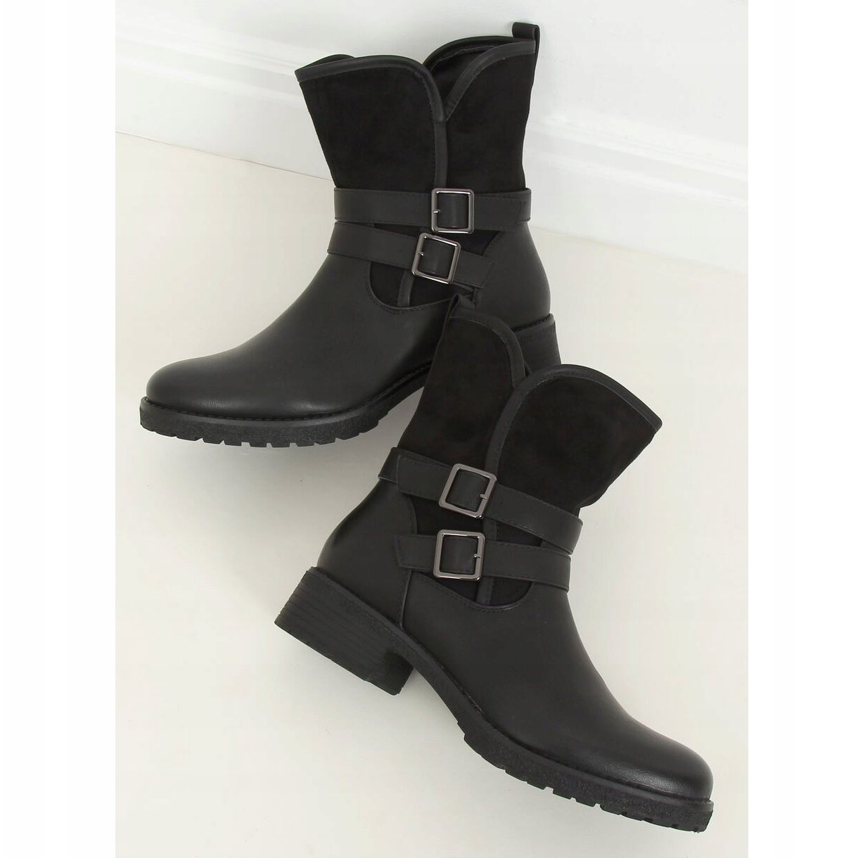 Izrađene od kombinacije ekološke kože i ekološke brušene kože, gležnjače izgledaju iznimno privlačno. Čista crna boja čini ih lakim za spajanje s raznim stilovima, što ih čini stalnim dijelom vašeg ormara. Trake s kopčama koje okružuju gornji dio daju im dodatni karakter, čime se cipele ističu od ostalih ravnih modela.