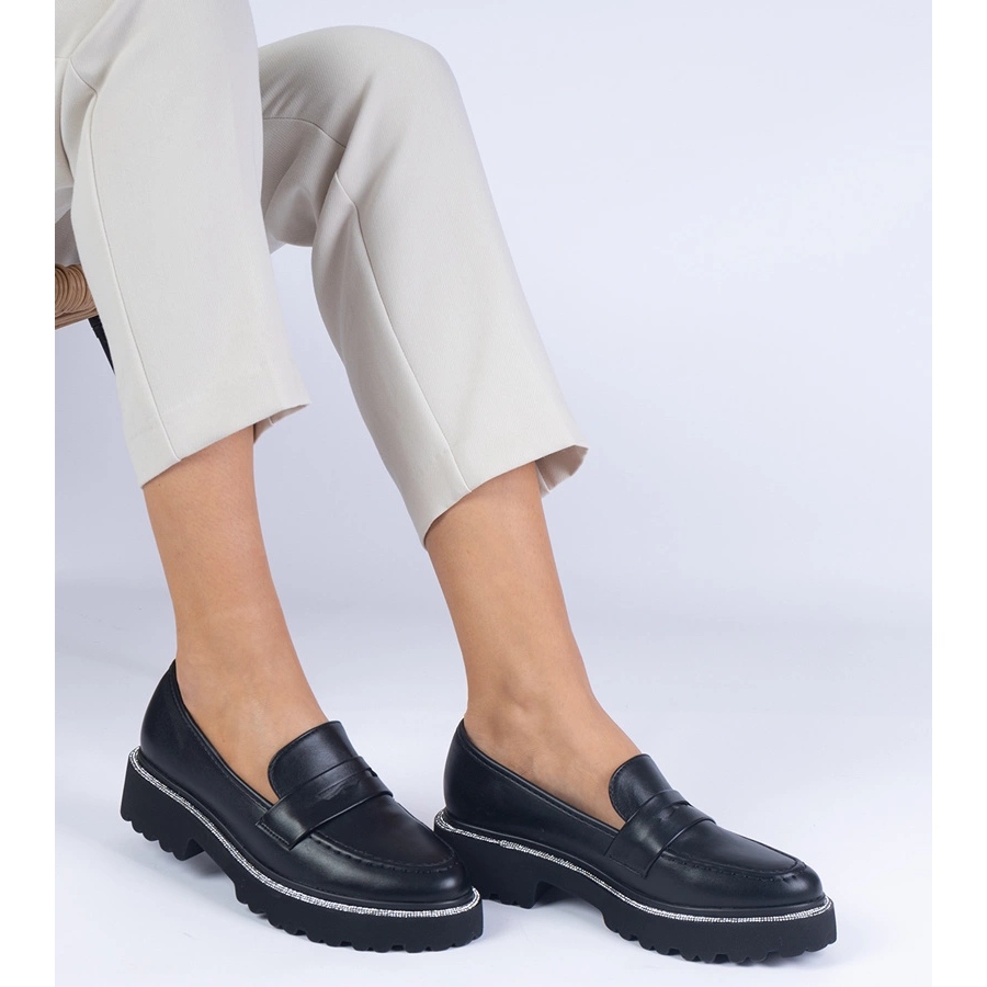 Napravljeni u cijelosti od ekološke kože, i vanjski dio i umetak jamče ne samo izdržljivost, već i jednostavnost skrbi. Topla crna dodatna suptilnim ukrasima u obliku cirkonija daje mokasinima jedinstven stil i eleganciju u usporedbi s tradicionalnim modelima.