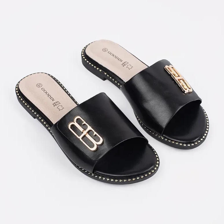 Pojedinosti: Goodin Crne ženske papuče na ravnom potplatu s ukrasom crna