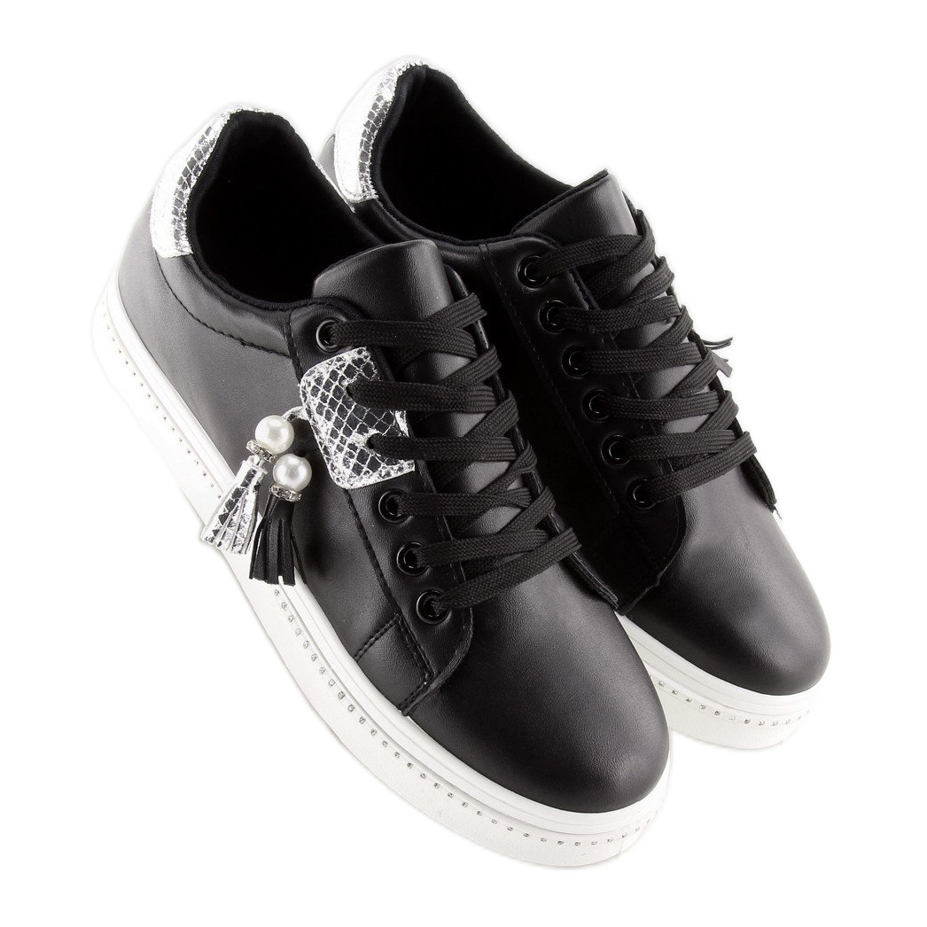Otkrijte jedinstveni stil uz ženske crne tenisice 88038 BLACK/WHITE koje će zasigurno postati neodvojivi element vašeg ormara. Njihov klasičan kroj u kombinaciji s modernim resicama ukrašenim biserima daje dašak elegancije svakom stajlingu. Suptilni obrub s kamenčićima oko potplata dodaje dašak glamura, čineći ih savršenima za ležernu i elegantniju odjeću.