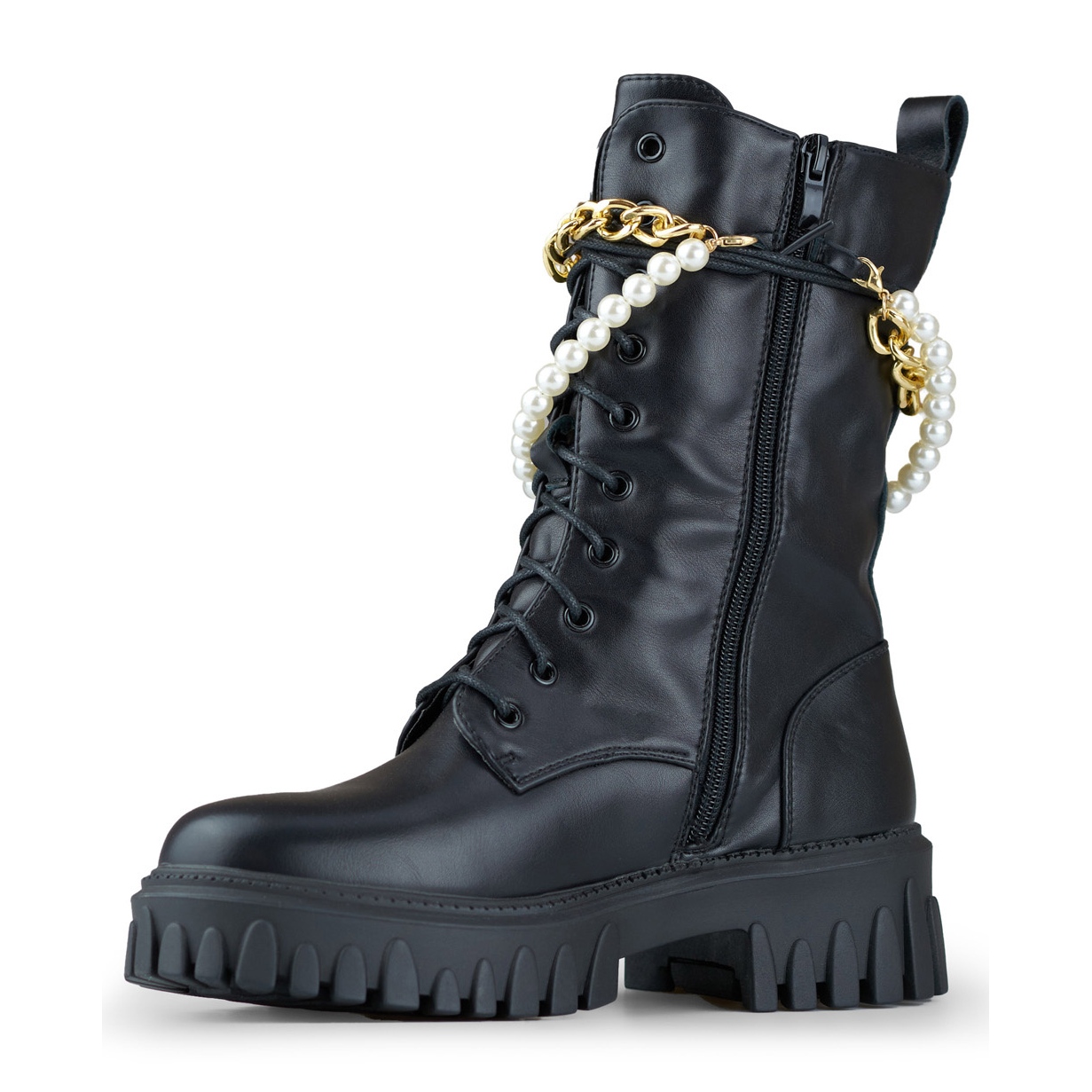 Moderni, bezvremenski crni radnici izrađeni od ekološke kože. Kombinacija stijena (rhinestones, lanac) s praktičnim rješenjima - dvorac i vezanje osiguravaju brzo stavljanje i savršeno uklapanje, a odvojivi ukras daje priliku da brzo promijeni izgled. Izolirana unutrašnjost čini da cipele djeluju tijekom jesenske/zimske sezone.