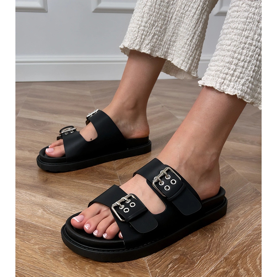 Otkrijte neusporedivu udobnost i moderan stil s crnim zakrilcima s stezaljkama na prugama, idealnim za ljetne dane. Napravljeni od organske kože, ovi flapovi kombiniraju skrb za okoliš s udobnošću nošenja. Klasična crna boja čini ih izuzetno svestranim, savršeno odgovarajućim i povremenim i elegantnim stilizacijama.