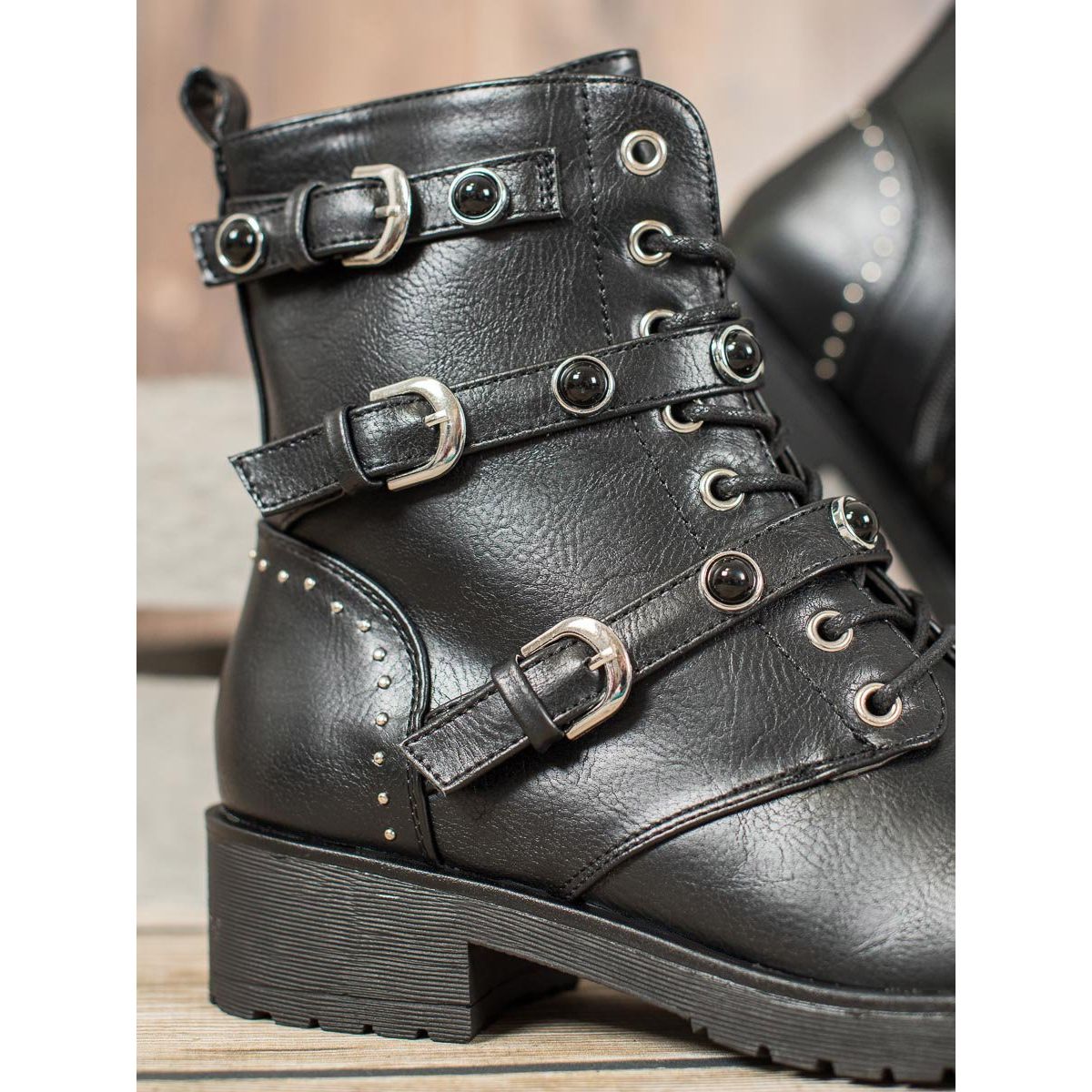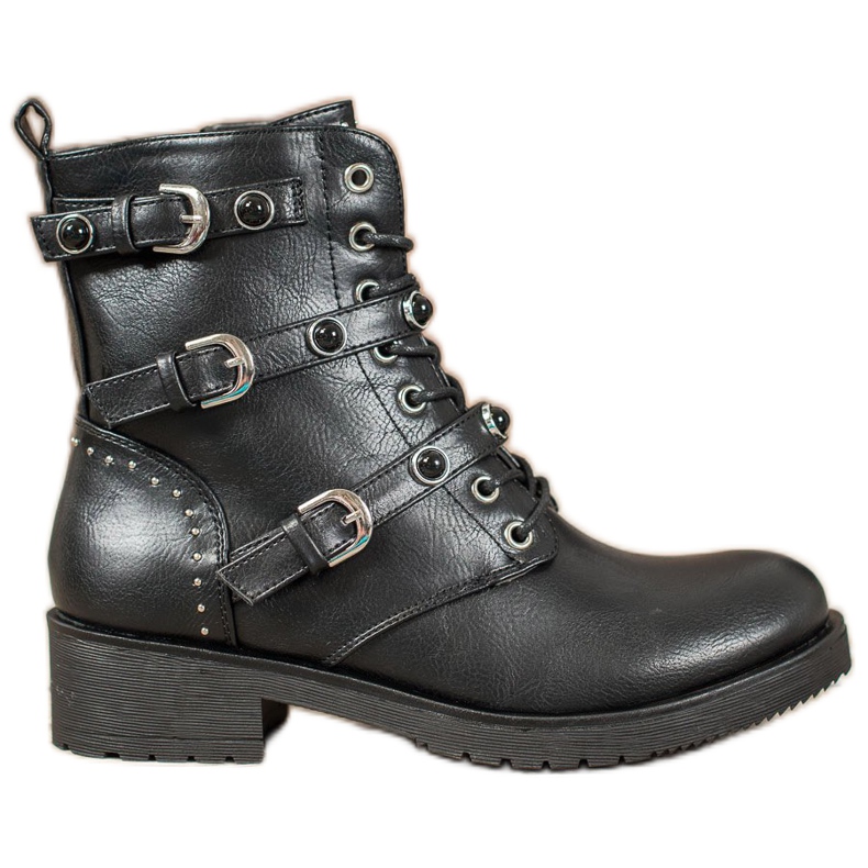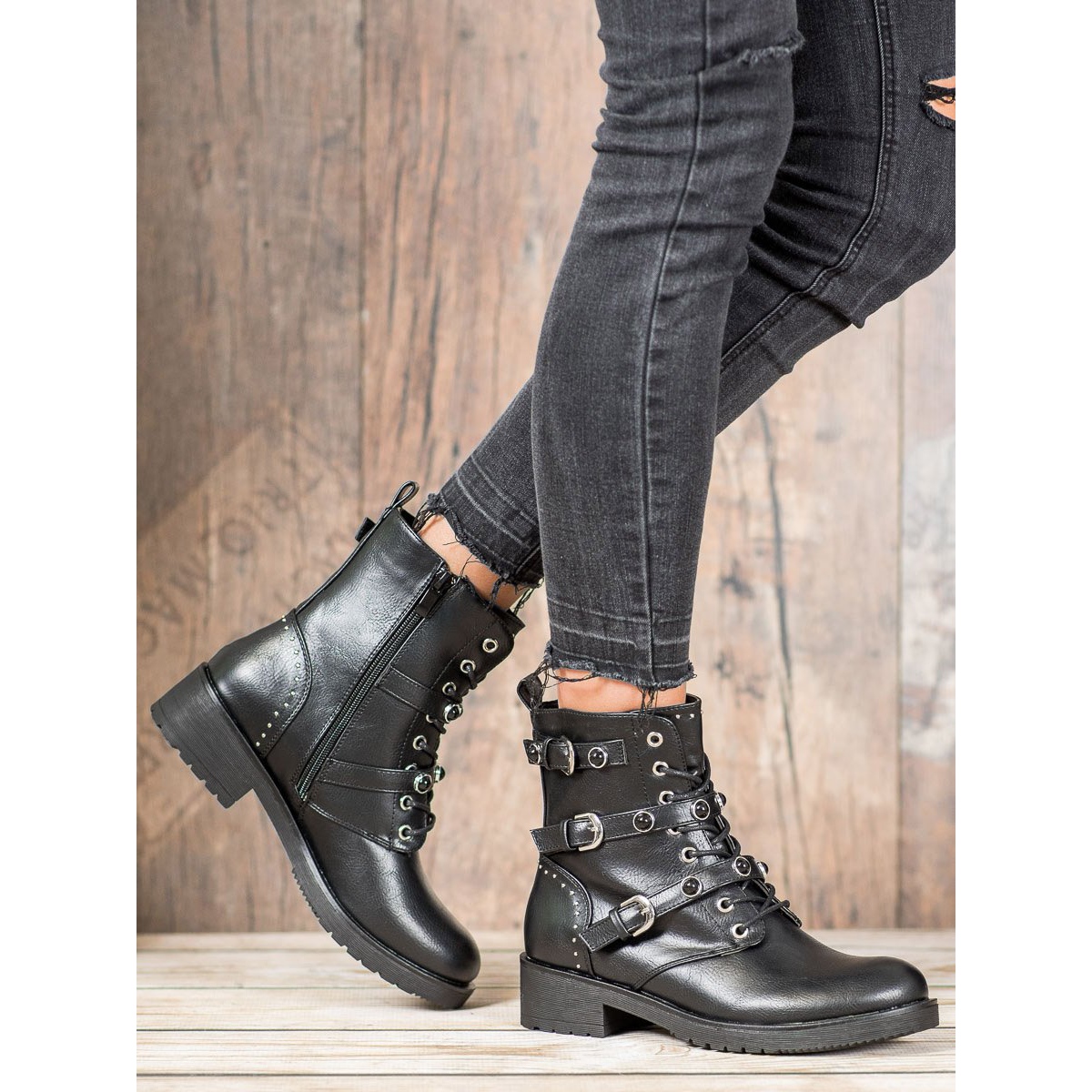 Ove jedinstvene čizme imaju vezivanje sprijeda i patentne zatvarače s unutarnje strane, što ih čini jednostavnim za obuvanje i izuvanje. Dodatno, ukrasni remeni s kopčama i kamenčićima dodaju im rock karakter čineći ih modnim naglaskom svakog stajlinga.