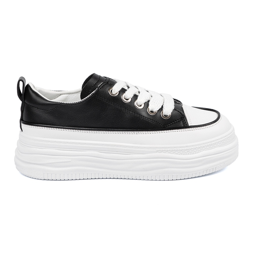 Tenisice se razlikuju klasičnom crnom bojom s bijelim naglascima koji im daju moderan izgled. Visoka platforma od 4,5 cm osigurava izvrsno jastuk i udobnost nošenja cijeli dan, a zahvaljujući izgrađenom -u mekoj hrani, stopalo je čvrsto podržano. Okrugli nos dodaje dodatni šarm i tenisice čine ne samo funkcionalnim, već i elegantnim.