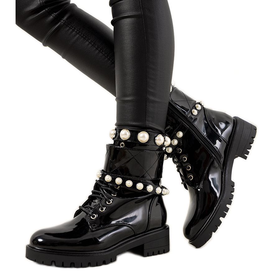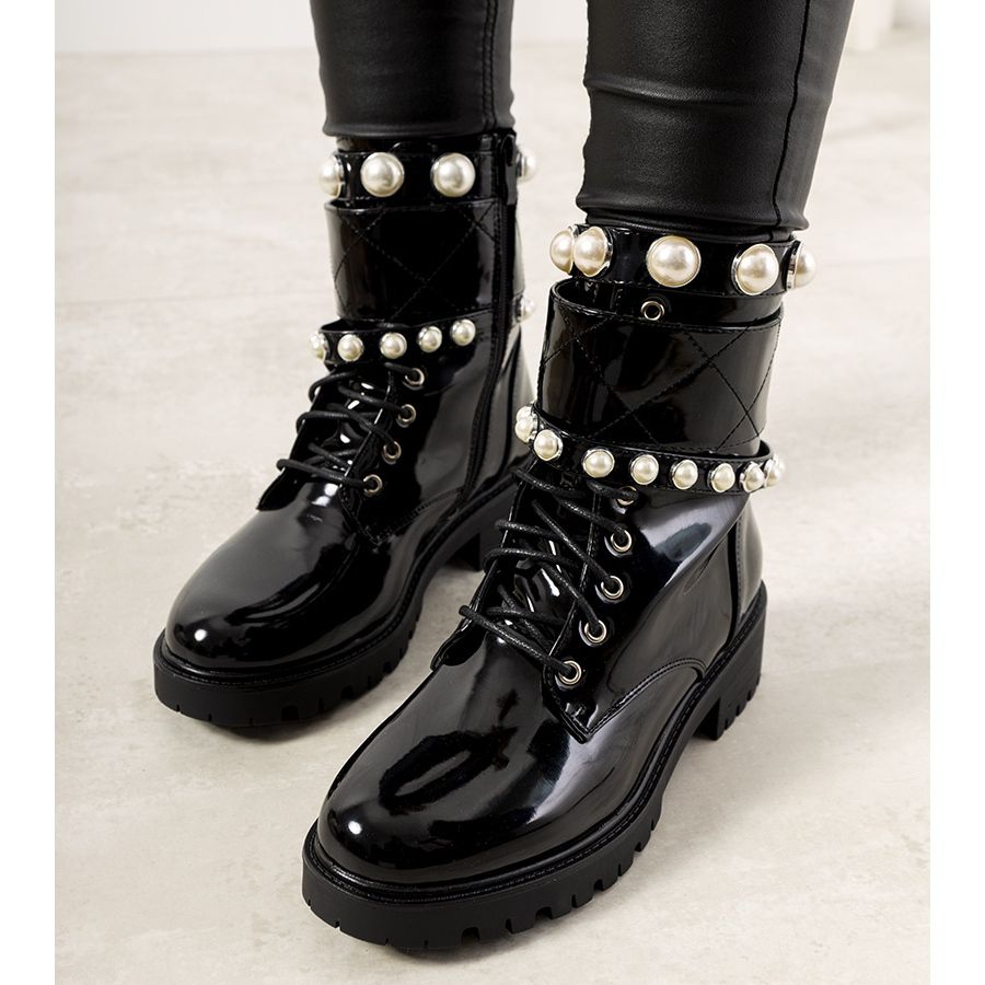 Visoki traper potplat, ukrašen ukrasnim prugama i prekrasnim biserima, daje cipelama karakter i savršeno se uklapaju u jesenske i zimske stilove. Dodatna izolacija u obliku kratkog krzna jamči toplinsku udobnost iu najhladnijim danima.