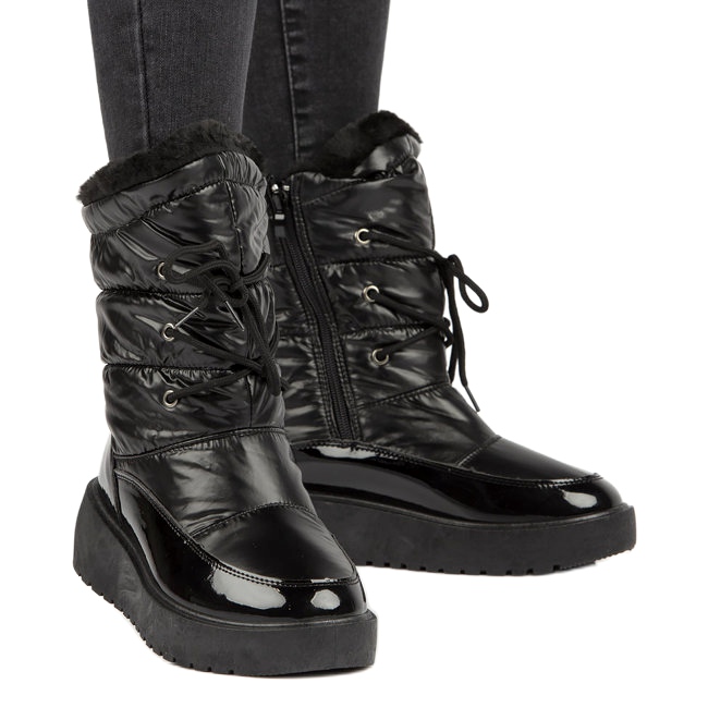 Njihova ravna peta visine 4,5 cm i sportski gornji dio jamče udobnost i stabilnost tijekom nošenja. Kopčaju se patentnim zatvaračem i vezicama, ove čizme za snijeg privlače pozornost svojim modernim stilom, a svojom univerzalnom crnom bojom pristaju uz svaki zimski stajling.